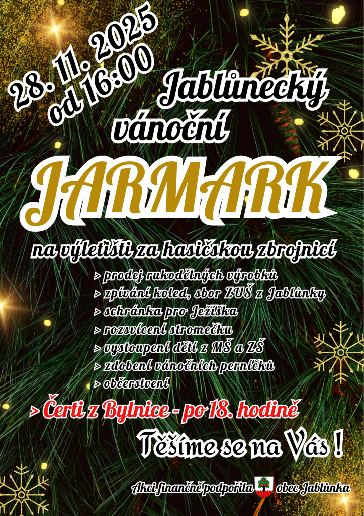 V pátek 28. 11. 2025 OD 16, 00 hodin se bude v Jablůnce konat Vánoční jarmark
