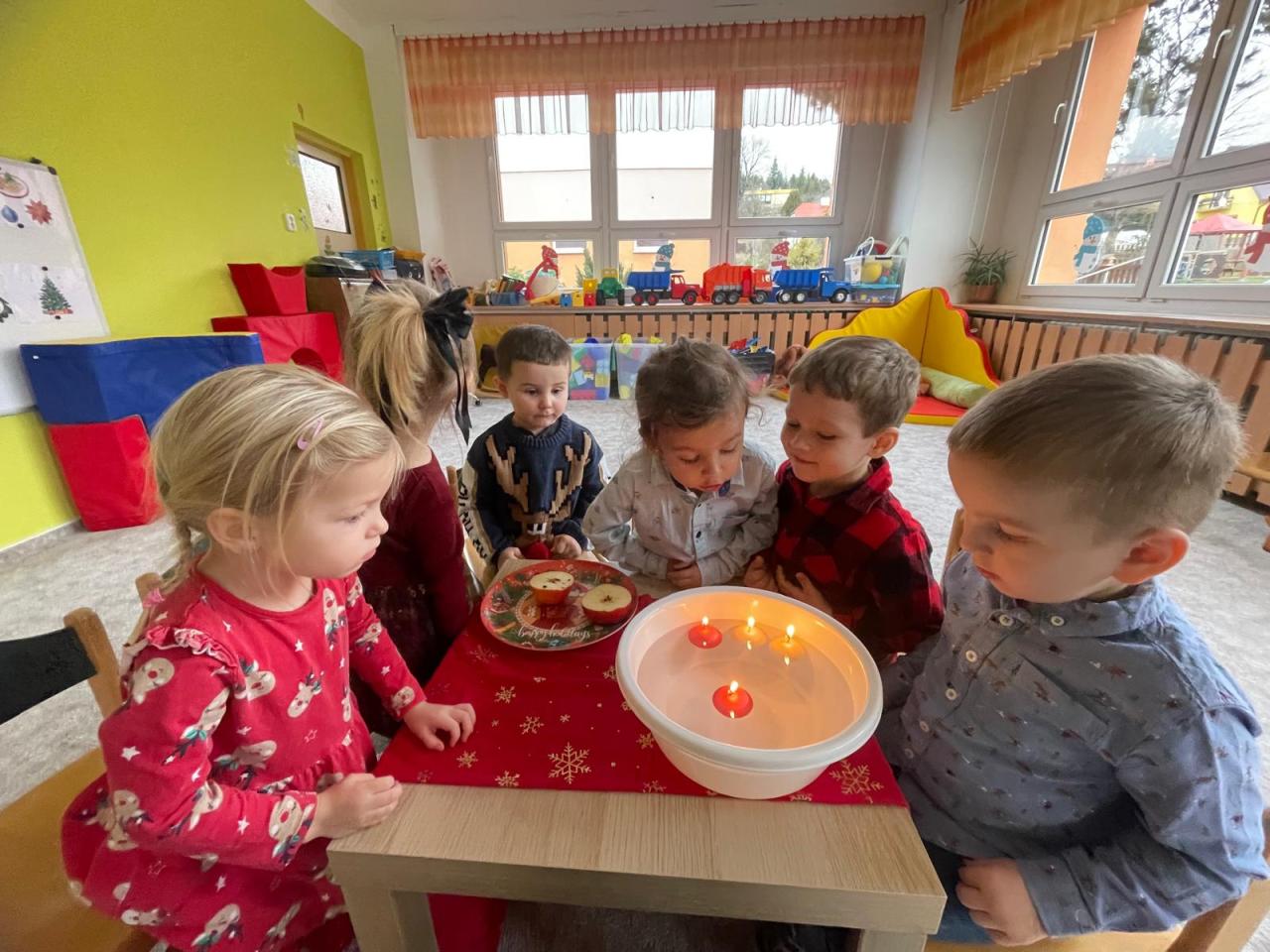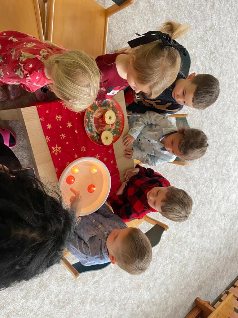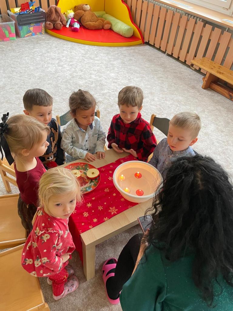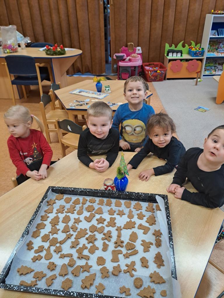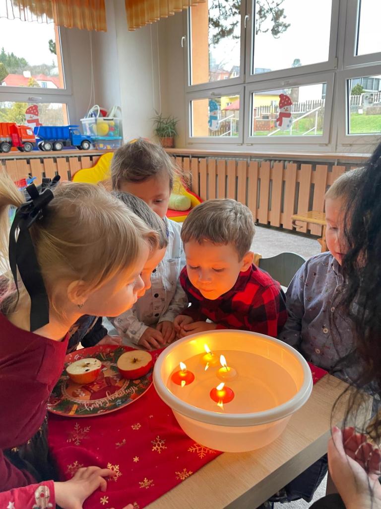 V prosincovém měsící se děti seznámily se zvyky a tradicemi Adventu a přicházejících Vánoc. Nechyběla ani návštěva Mikulášské družiny a pečení perníčků. Také nás ve třídě navštívil Ježíšek s krásnými dárečky a hračkami pro děti. V závěru týdne jsme si zazpívali vánoční koledy s většími dětmi ze třídy Červená a Zelená jablíčka.