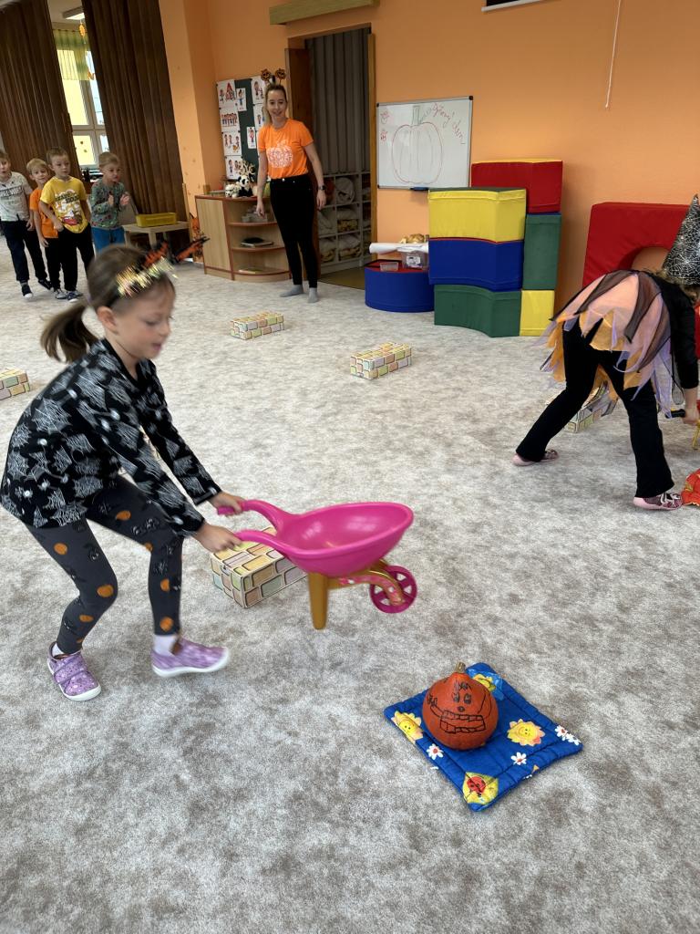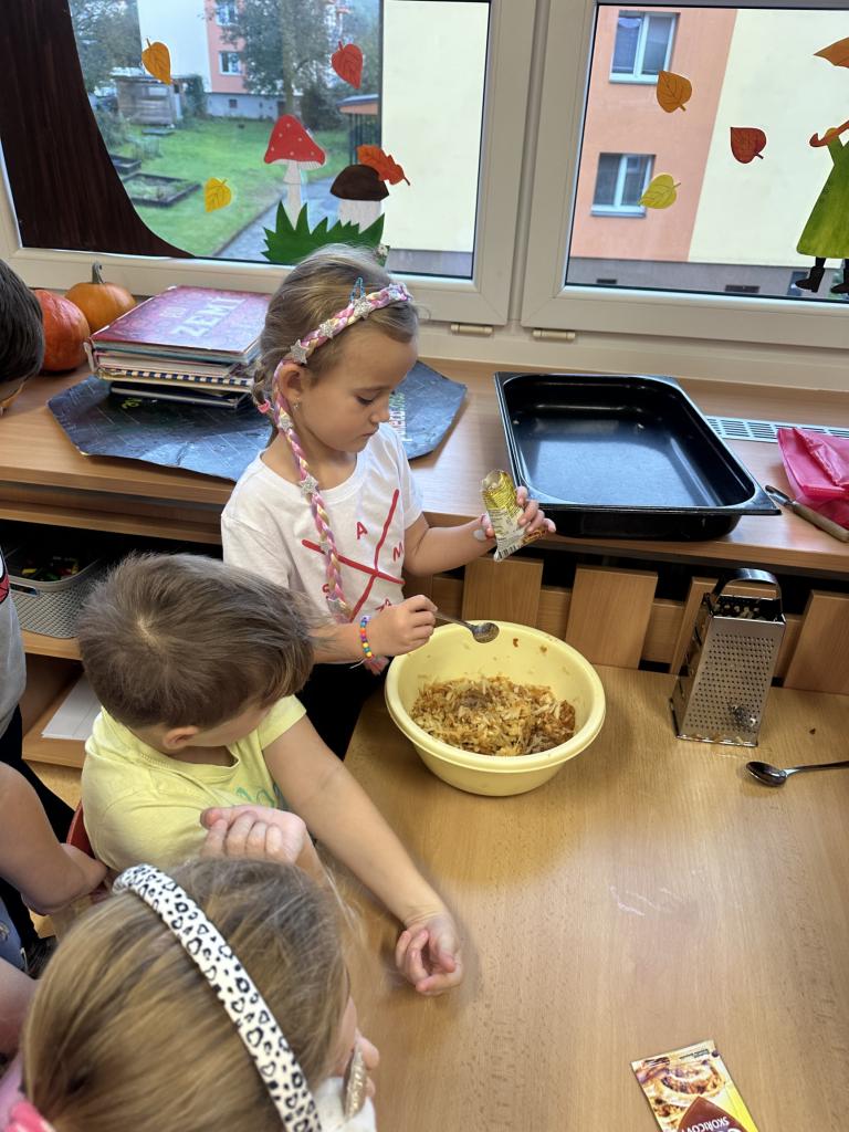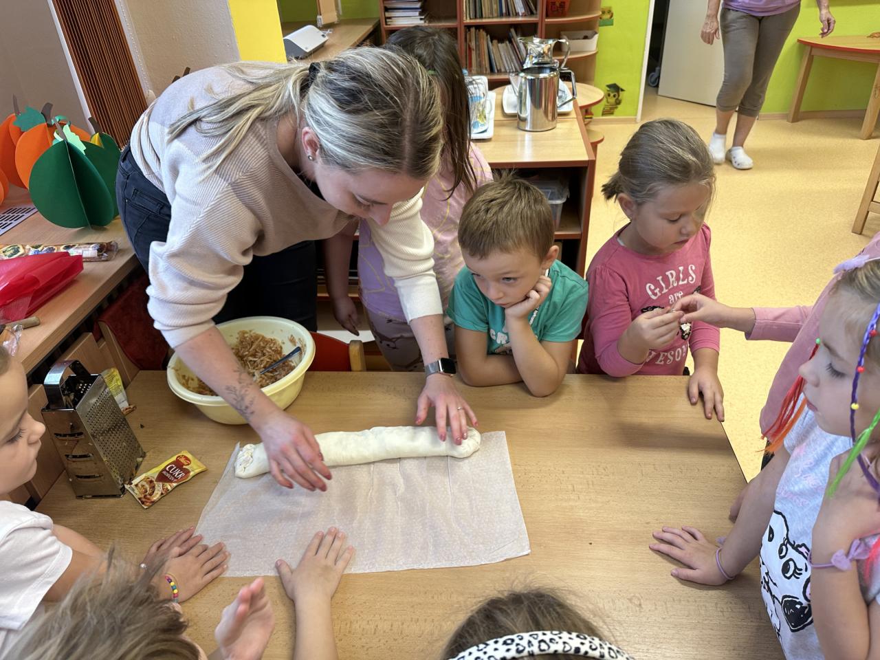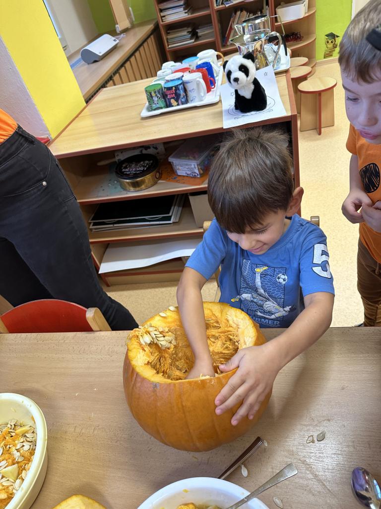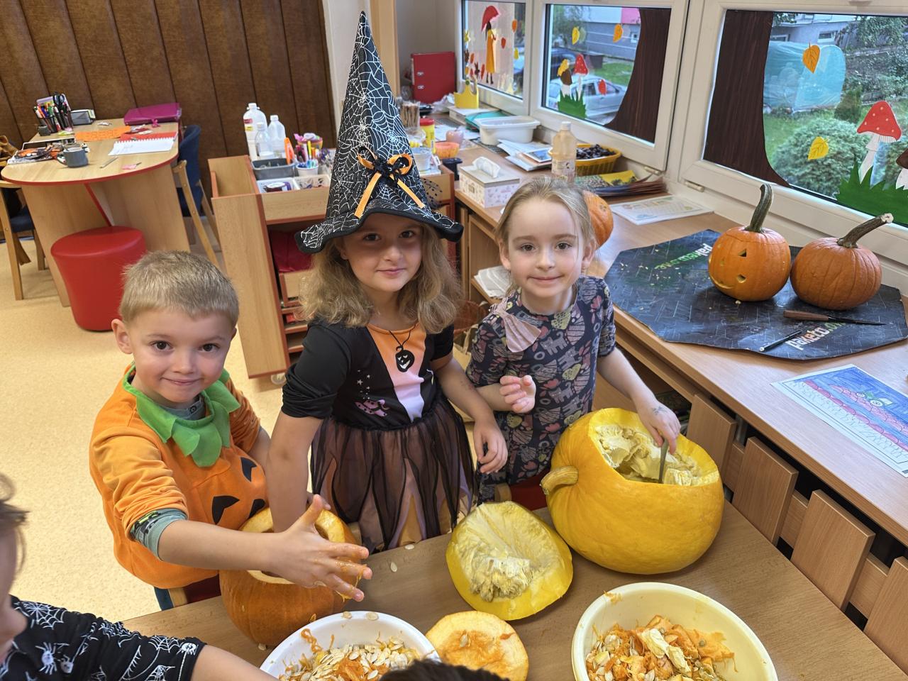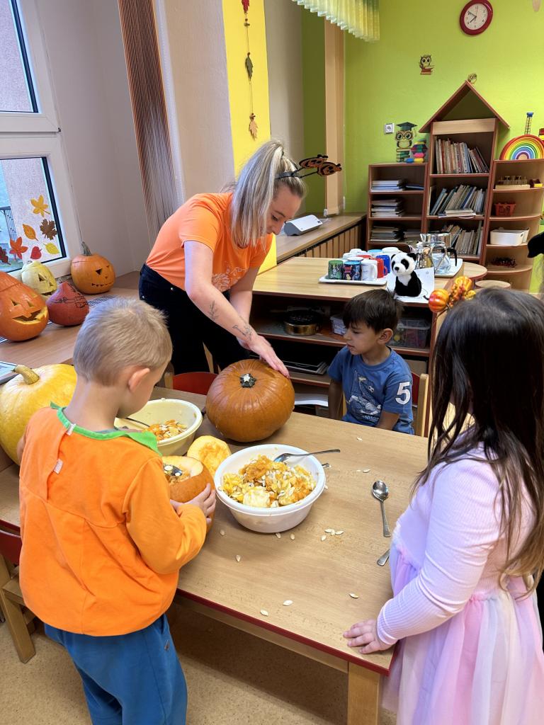 S dětmi jsme si ovocno- zeleninový týden užili. Děti v úterý připravovaly štrůdl, který nám šikovné paní kuchařky upekly. V rámci dýňového dne ve čtvrtek si děti vydlabávaly dýni a zasoutěžily si. Za odměnu jsme si s dětmi udělali diskotéku. Zahráli jsme si spolu spoustu pohybových her k tématu ovoce a zelenina. Naučili jsme se písničku "Podzimní zahrádka".