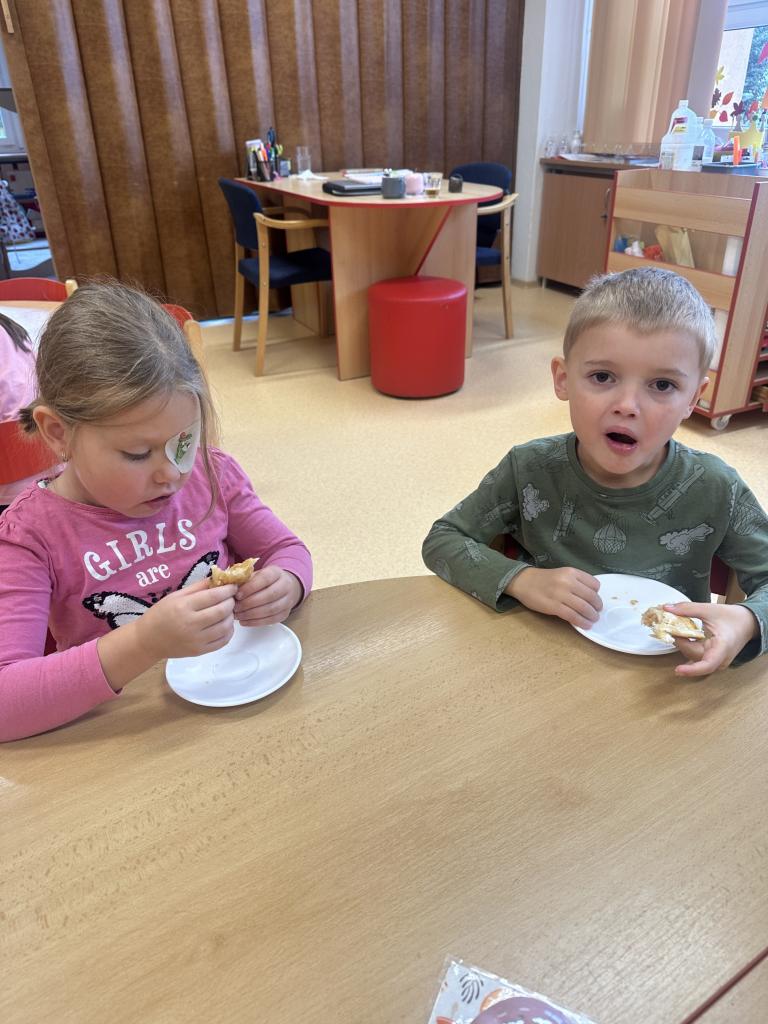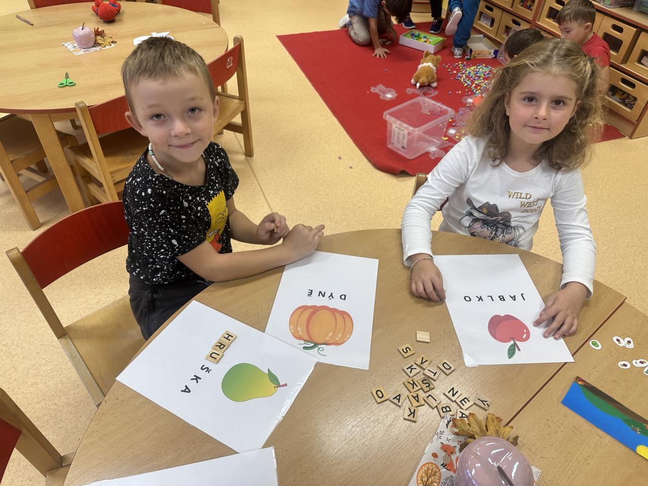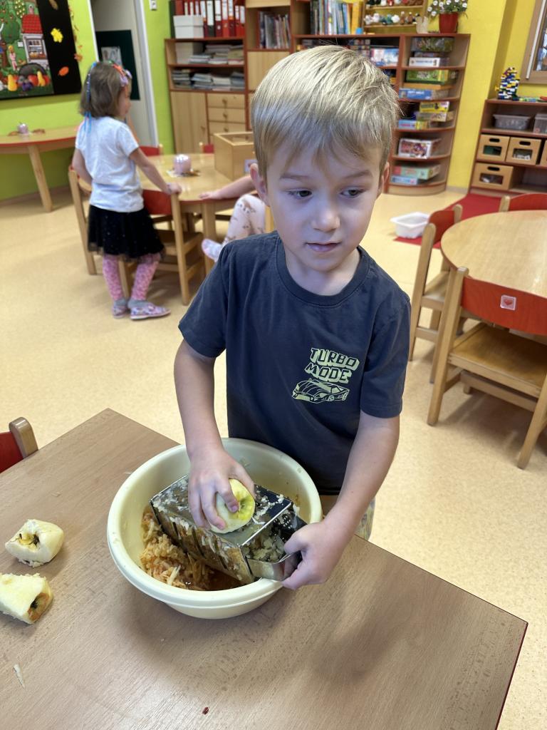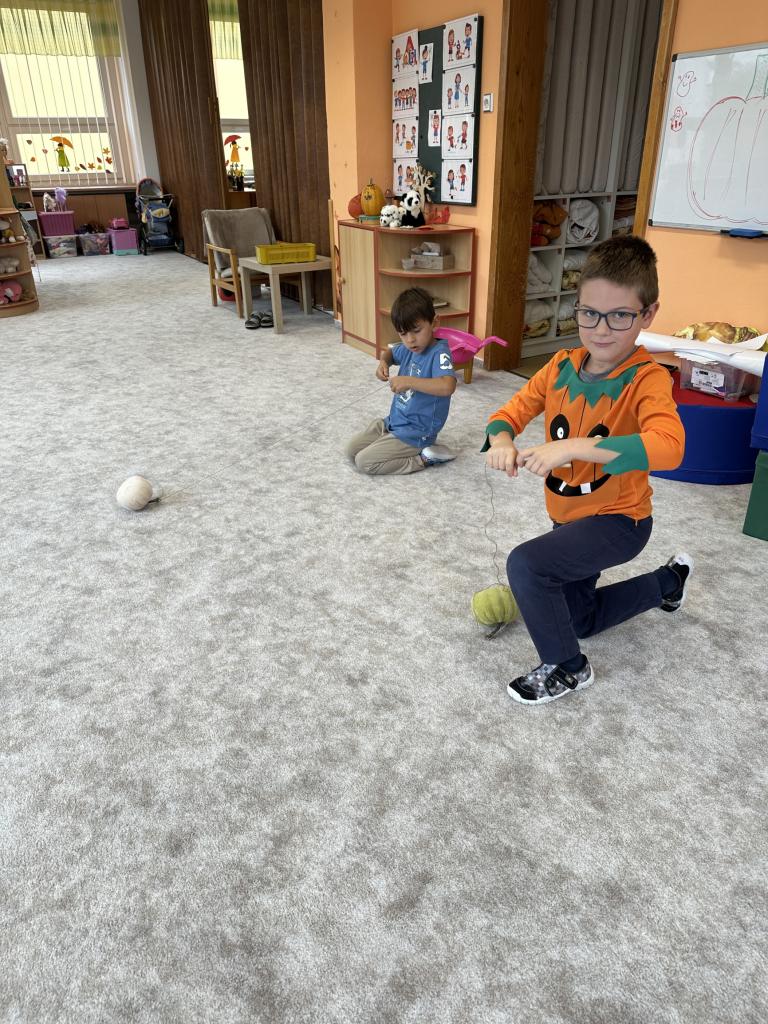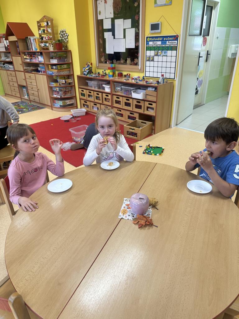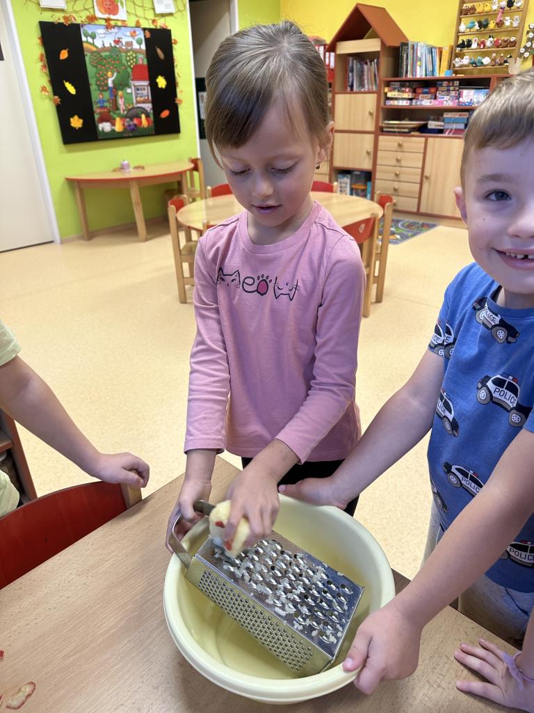 S dětmi jsme si ovocno- zeleninový týden užili. Děti v úterý připravovaly štrůdl, který nám šikovné paní kuchařky upekly. V rámci dýňového dne ve čtvrtek si děti vydlabávaly dýni a zasoutěžily si. Za odměnu jsme si s dětmi udělali diskotéku. Zahráli jsme si spolu spoustu pohybových her k tématu ovoce a zelenina. Naučili jsme se písničku "Podzimní zahrádka".