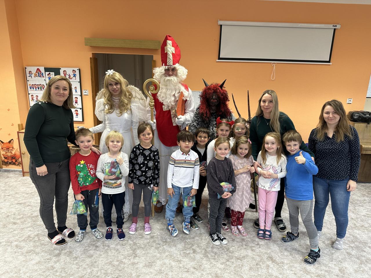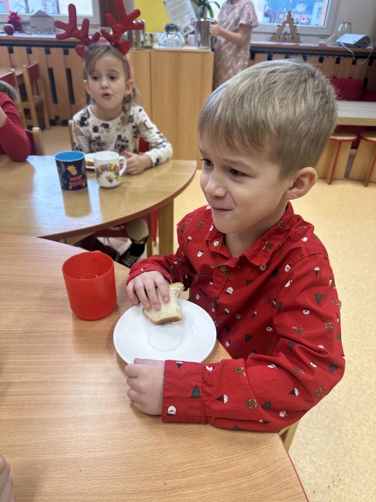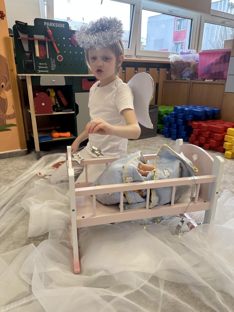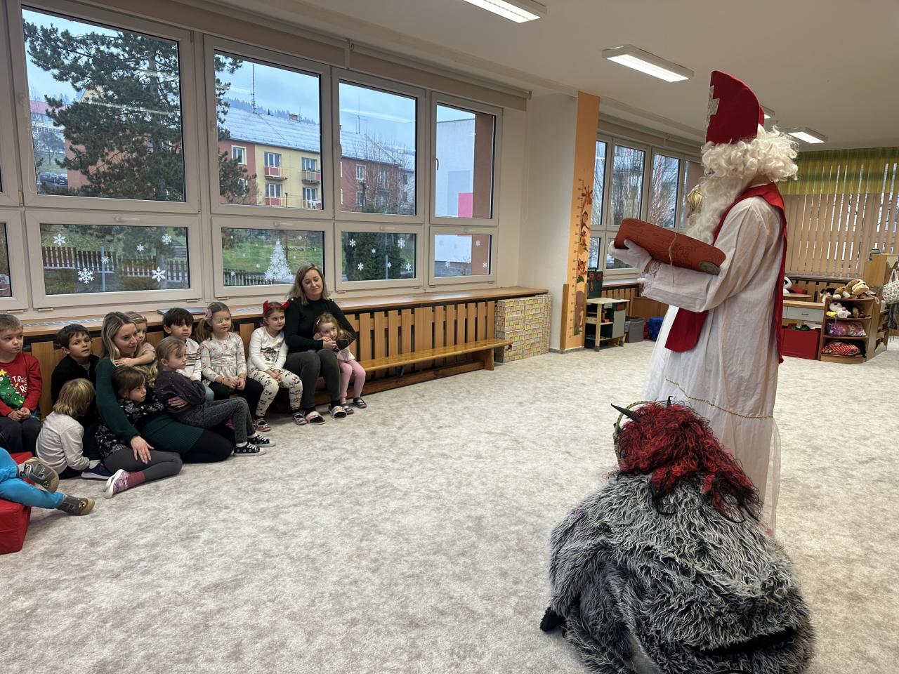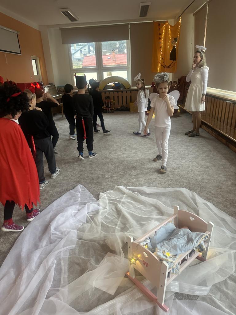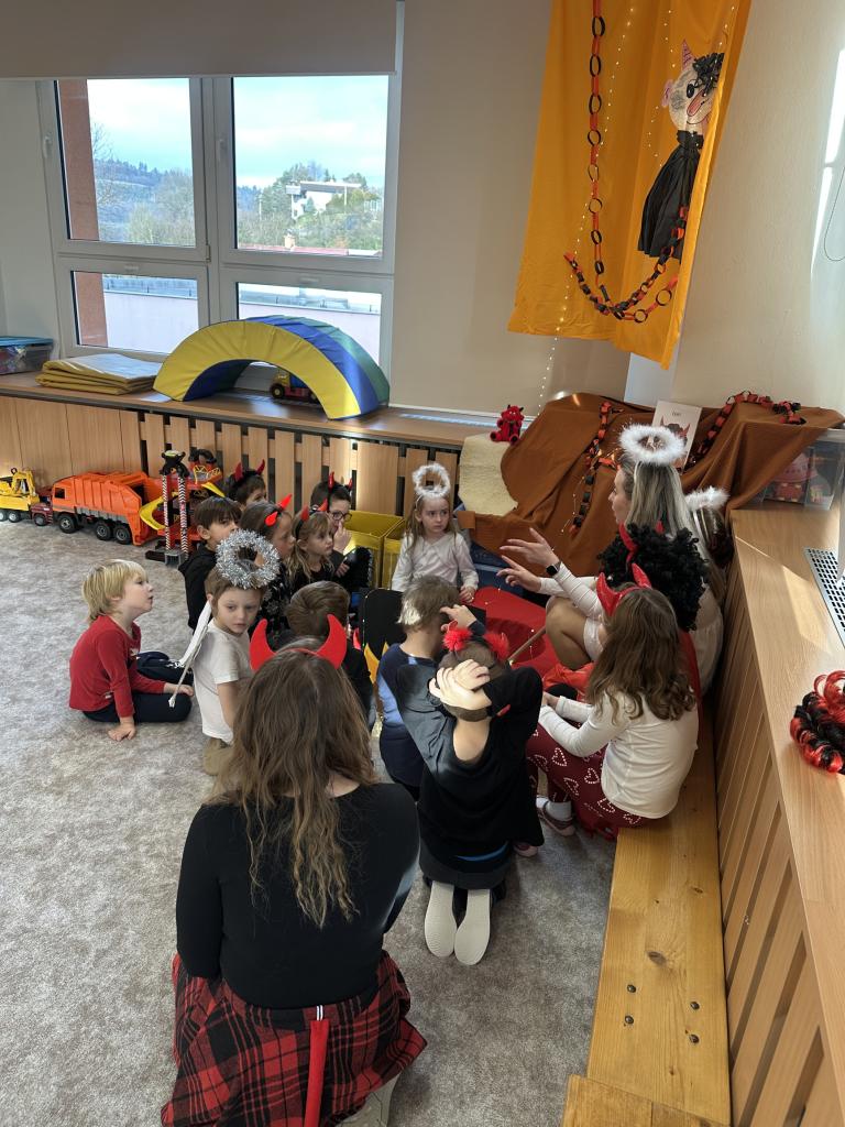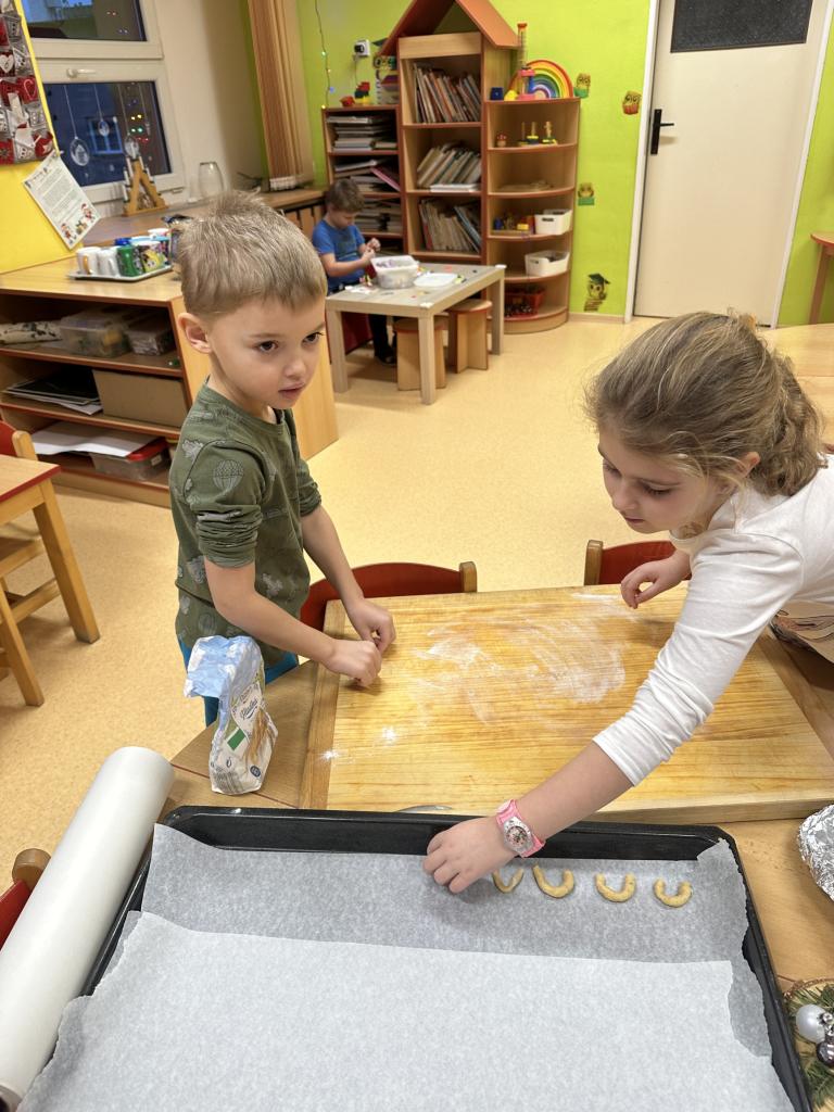 Prosinec byl pro nás plný zážitků. Přišel k nám Mikuláš se svou družinou, naštěstí si nikoho z nás neodnesl čert. Děti také mohly přijít v kostýmu čertíka, anděla nebo Mikuláše. Společně jsme si užili krásné dopoledne plné her. Navštívili nás také skřítci - pomocníčci Ježíška. Skřítci kontrolovali, jestli si ve školce umí děti hezky hrát a pomáhat si. V předvánočním čase jsme se učili koledy, zkoušeli si různé tradice a čekali na příchod Ježíška. Užili jsme si spolu krásný adventní čas . Ježíšek k nám opravdu přletěl a přinesl nám překrásné dárečky.