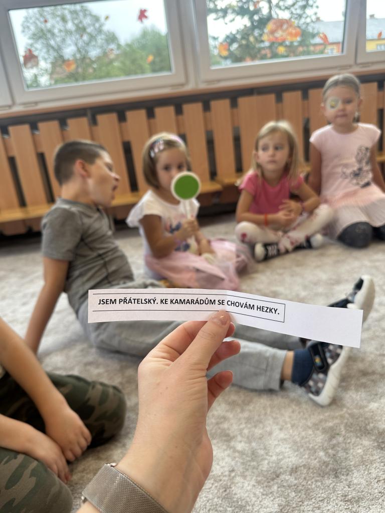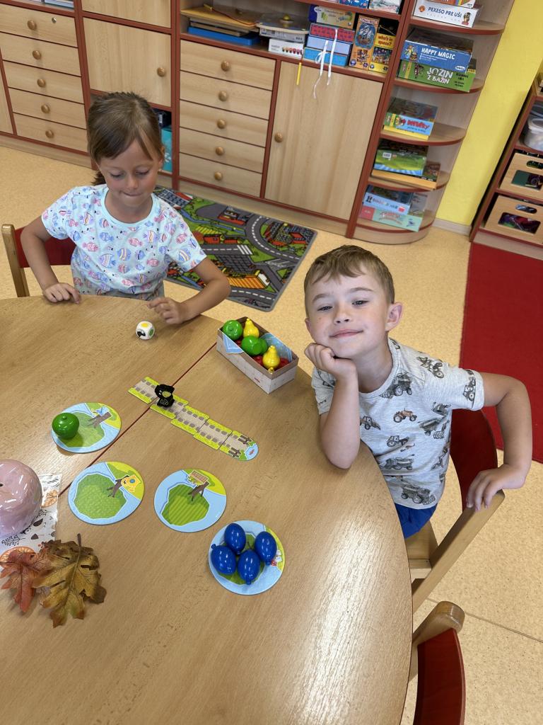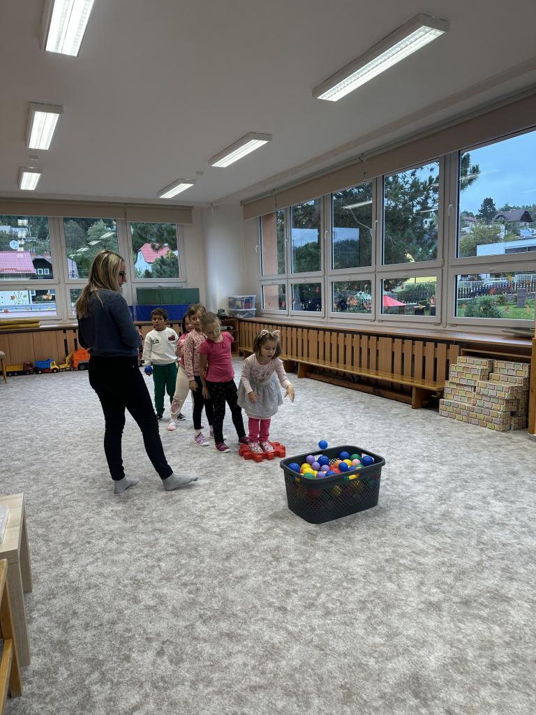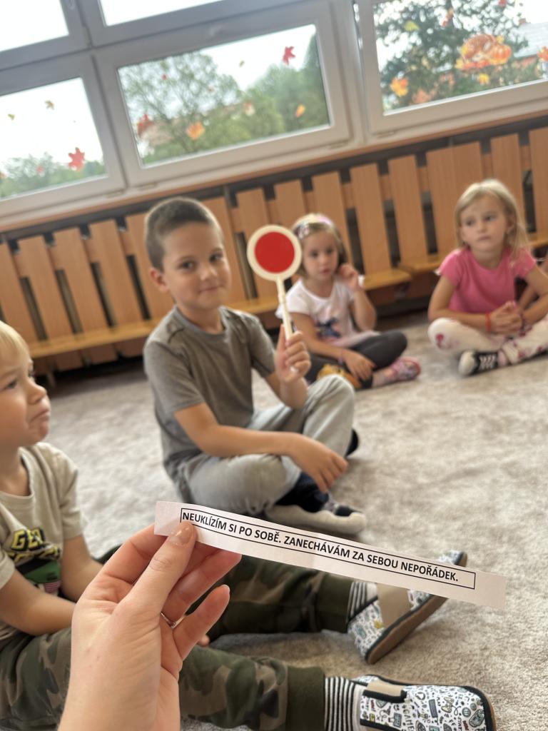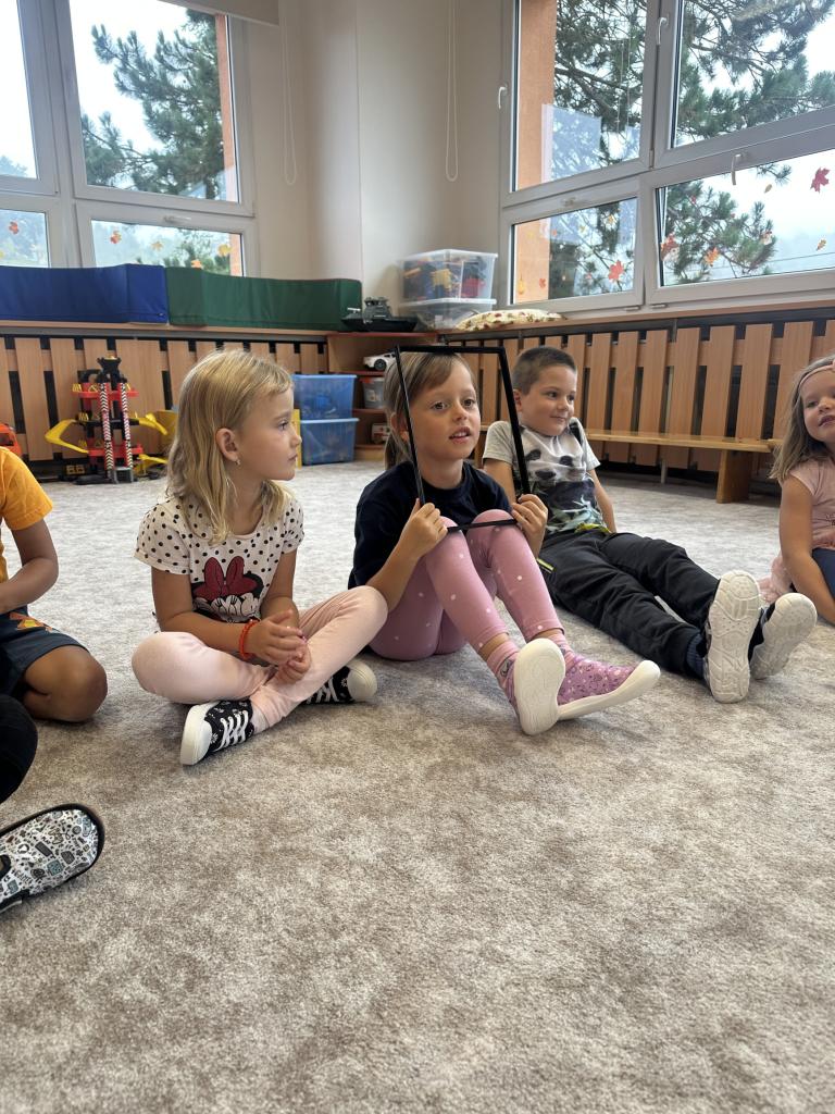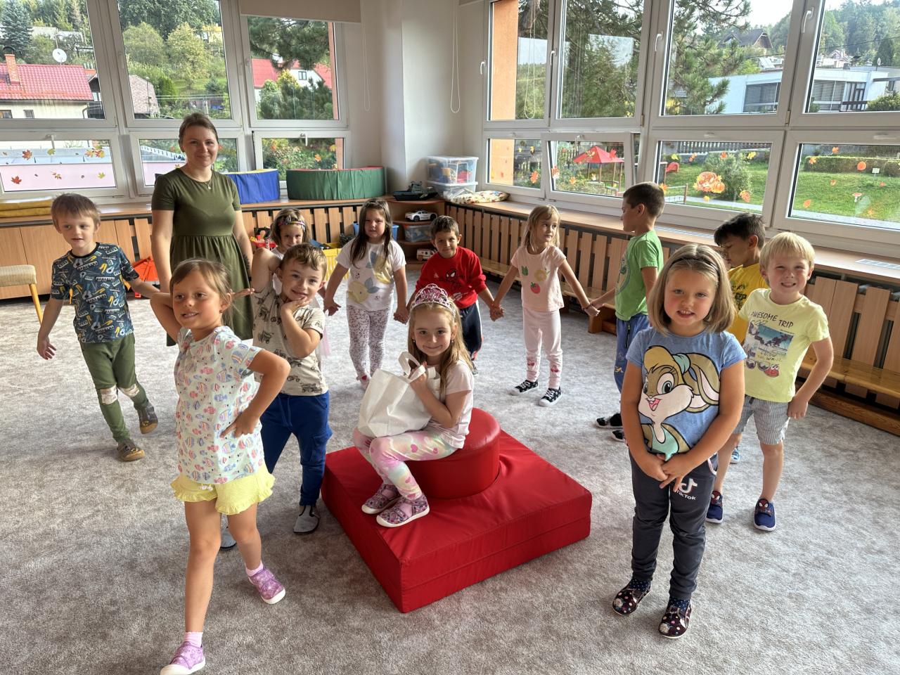 Děti se seznamovaly s novou třídou, prostory a novými hračkami. Připomínali jsme si pravidla třídy, jak se máme správně chovat k sobě, kamarádům a k paním učitelkám. Povídali jsme si o naší Jablůnce a říkali si rozdíly mezi vesnicí a městem.