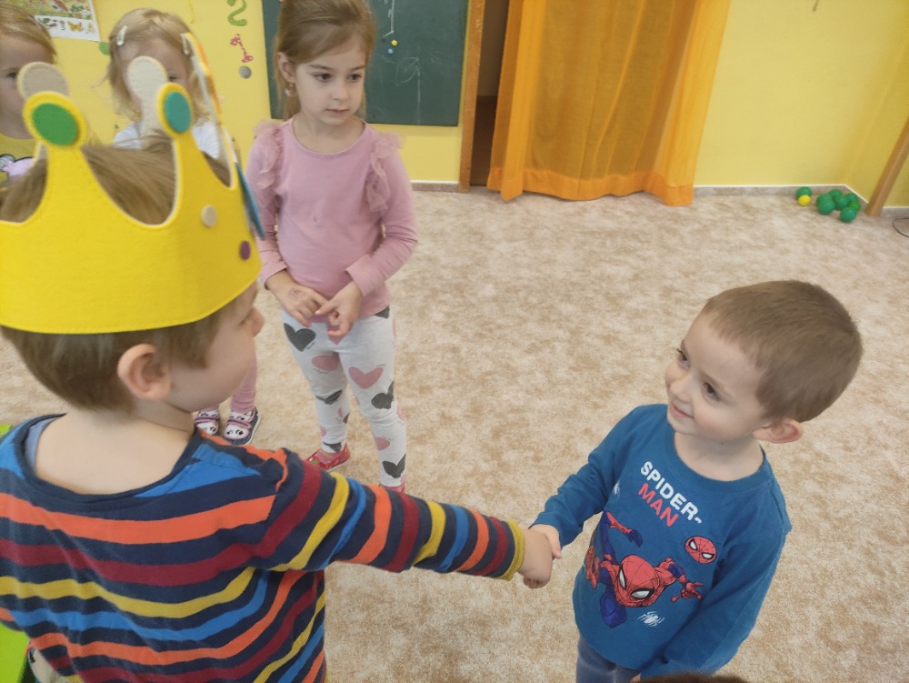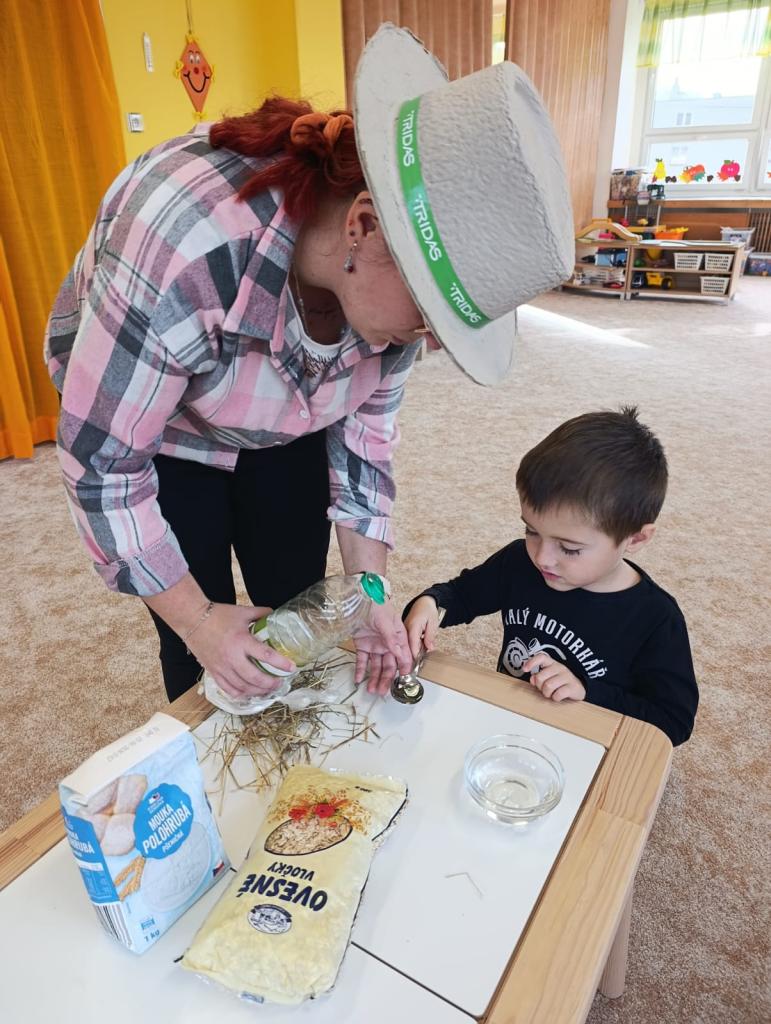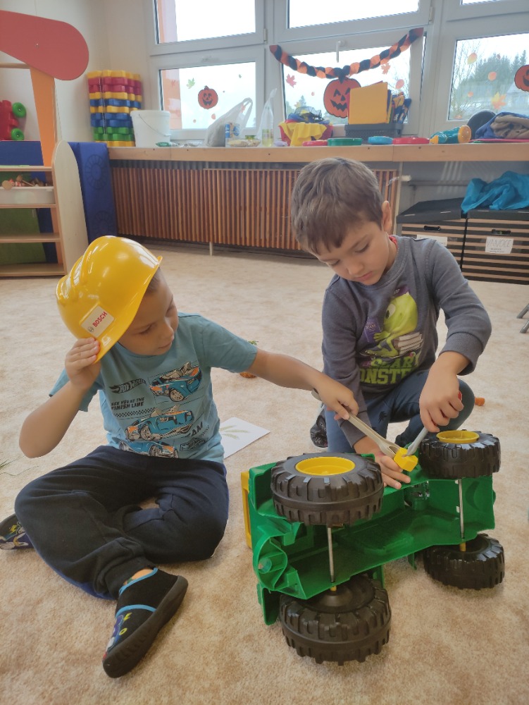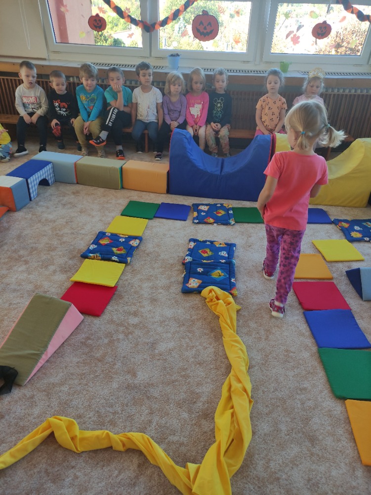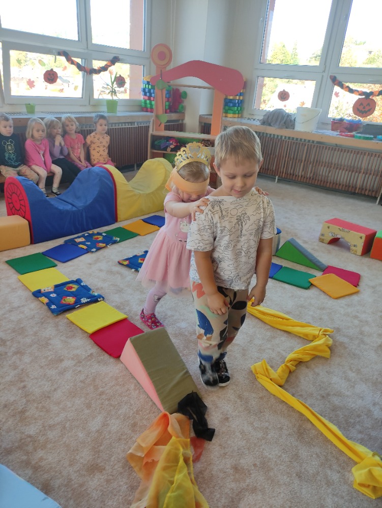 Měsíc říjen jsme s dětmi zahájily tématem podzim na poli, kdy si děti zkusily proběhnout kukuřičné pole a pomáhaly paní učitelce opravit traktor. Z pole jsme se společně přesunuli do lesa, kde děti chodily po stopách zvířátek a zahráli si pohádku o Červené Karkulce. Vyzkoušeli si zacvičit jógu, ale ne podle paní učitelky, ani cvičitelky, ale podle daného zvířátka, které mělo svůj protahovací cvik. Měsíc jsme ukončily s dětmi tím, že jsme pomohli zvířátkům posbírat papání, postavit domeček a poté jsme je pomocí ukolébavky a hudebních nástrojů uspali. V průběhu měsíce jsme spolu oslavili spoustu narozenin a měli jsme i jednu pyžamovou oslavu :)