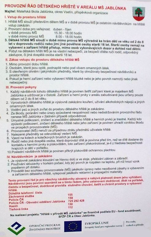 Pravidla užívání hřiště jsou stanovena “Provozním řádem”, který je umístěn u vstupu do areálu MŠ Jablůnka.